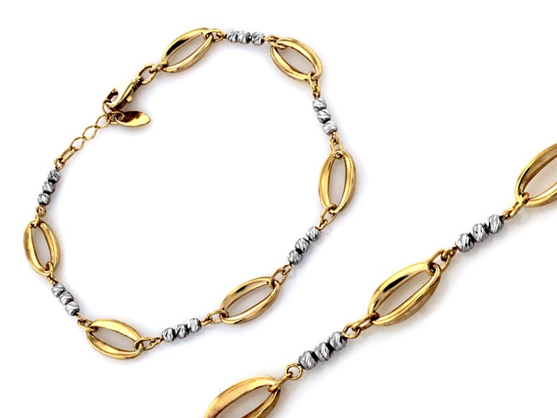 Złota bransoletka z białego złota z kuleczkami i płaskimi podłużnymi ogniwami z żółtego złota – próba 375, waga 3,15g, 19cm