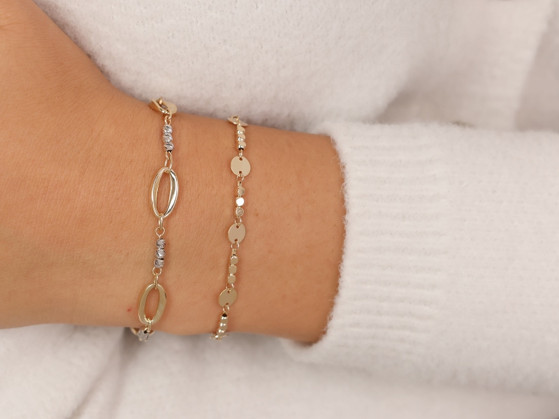 Złota bransoletka z płaskimi podłużnymi ogniwami i białymi złotymi kuleczkami to wyjątkowy dodatek, który łączy nowoczesny design z ponadczasową elegancją, tworząc biżuterię idealną na każdą okazję.