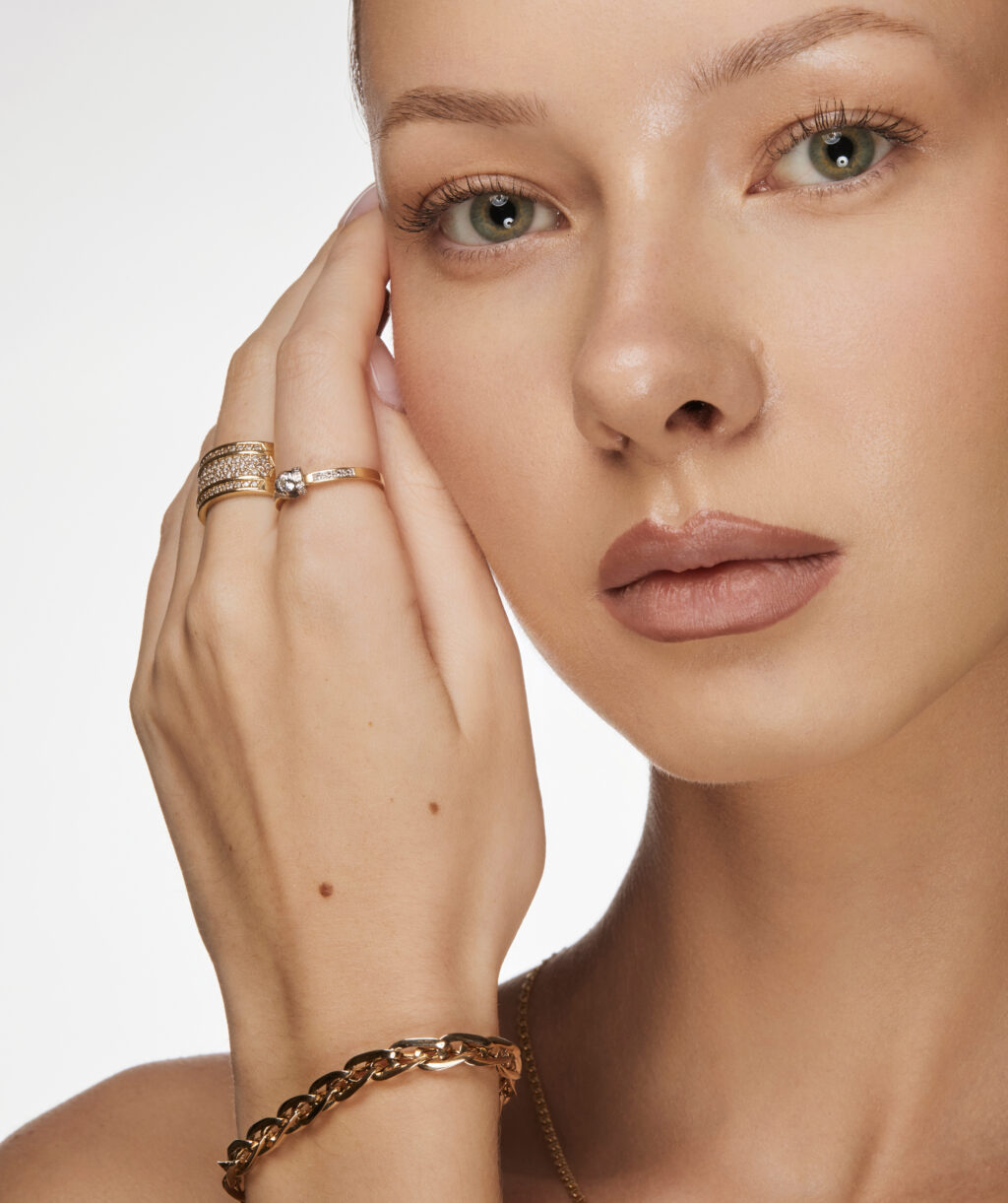 Elegancki pierścionek wykonany ze złota próby 585 (14 karatów), zachwycający klasycznym i ponadczasowym designem. W centralnej części oprawiony jest jeden kamień główny, który stanowi wyjątkowy punkt przyciągający wzrok. Po jego bokach umieszczono drobniejsze kamienie boczne, subtelnie podkreślające blask i głębię kompozycji.